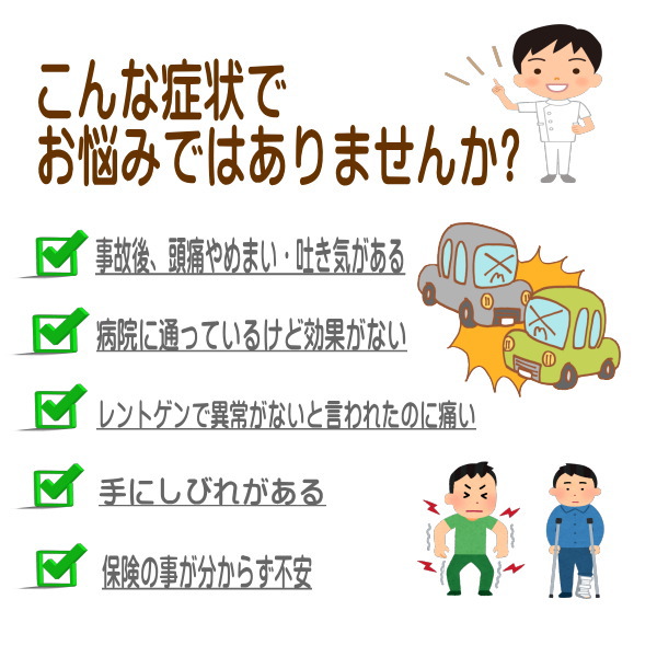 中には交通事故によるむち打ちを放置し、時間が経って症状が現れ、体調不良が続いている方もいらっしゃいます。