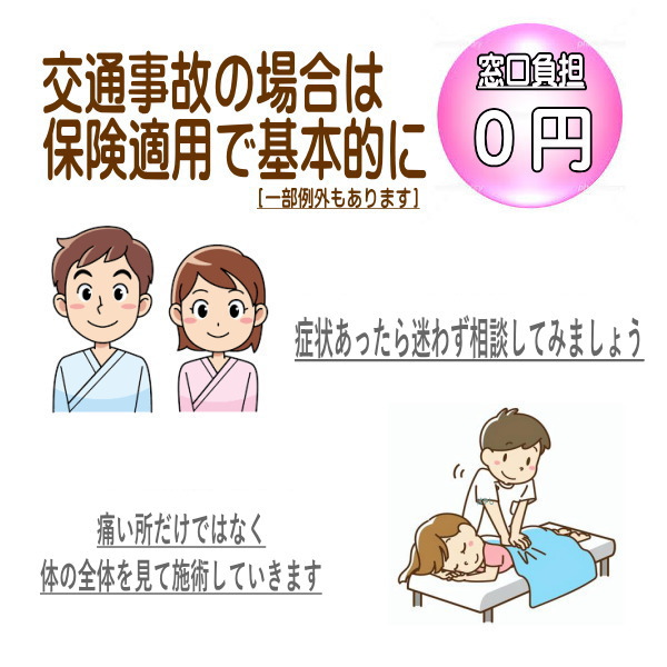 交通事故の場合、自賠責保険の適用により、患者様の窓口負担はございません。